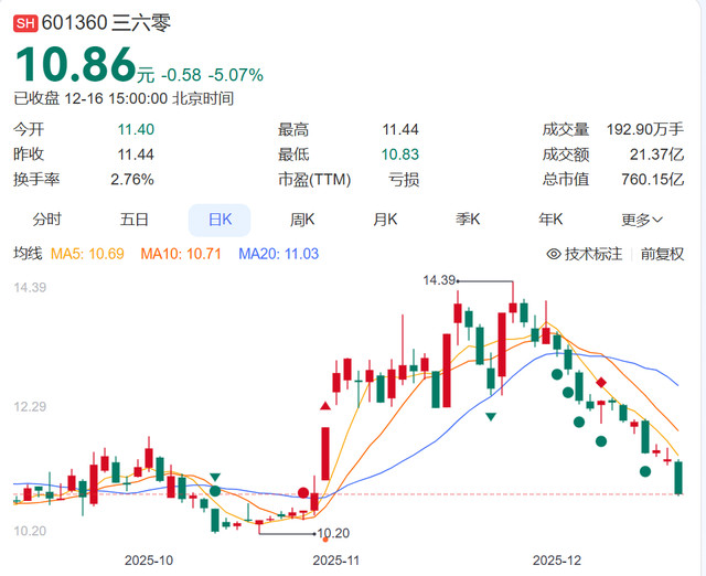 12月16日,三六零股价下跌,截至收盘跌超5%,报10.86元,本月以来已跌超20%。总市值760.15亿元,单日蒸发超40亿元。
