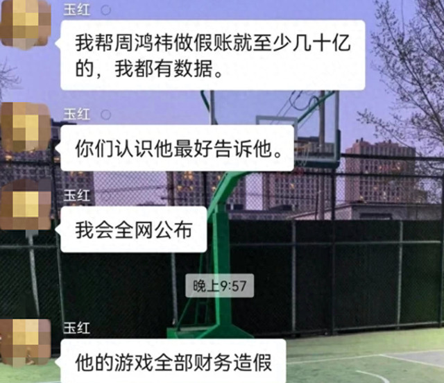 12月16日,据网传截图,前360高级副总裁、三点钟社群核心发起人玉红,在朋友圈和多个群聊中对周鸿祎进行“攻击”。玉红在群聊中表示:“我帮周鸿祎做假账就至少几十亿的,我都有数据。我会全网公布,他的游戏全部财务造假。”其还在群内强调自己没有被盗号。